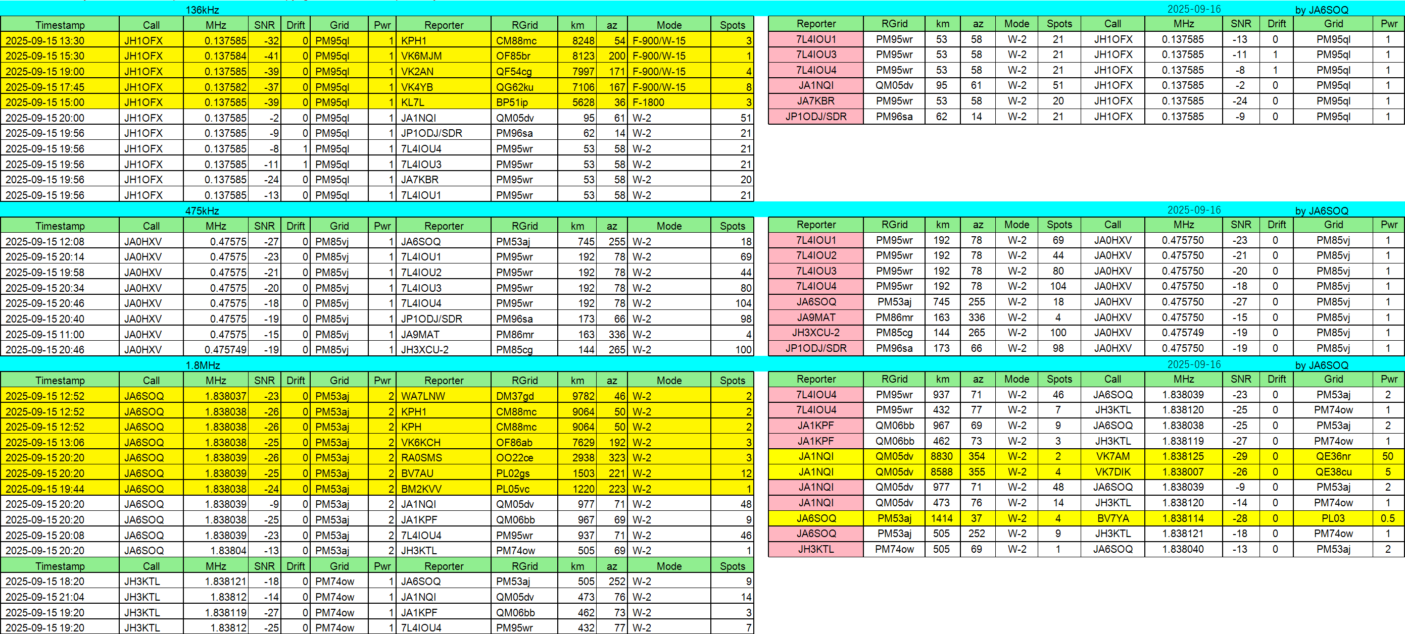 9月2日 集計136kHz/475kHz/1.8MHz - JA6SOQ